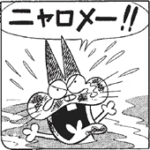 赤塚不二夫の描いた「もーれつア太郎」に初めて登場し、その後も同氏の数多くの作品に脇役(わきやく)として出演する、二本足で立って人間の言葉をしゃべる、口は悪くていたずら好きですが、憎(にく)めないキャラクターニャロメ。このニャロメの名前の由来(ゆらい)ですが、当時、赤塚不二夫と交流のあった人物の1人に、マンガ家で美術家のタイガー立石がいました。そして、彼の描いた作品の中で、「コンニャロメ!」というセリフが、よく使われていました。