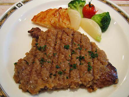 薄くのばした牛肉をタマネギに浸けて焼いた、「シャリアピンステーキ」。