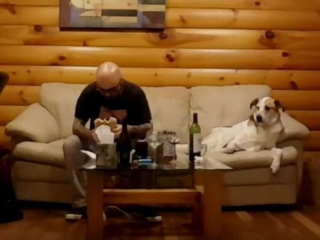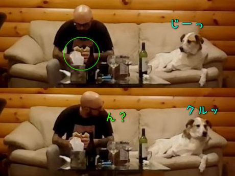 主人:「今、見てた?」犬:「見てないワン!」…食事をチラ見する犬