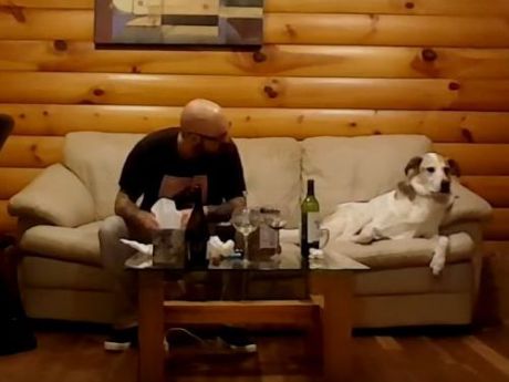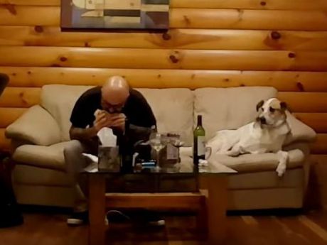 飼い主の男性が目を合わせるたびに、「見てないワン!」と視線を外(はず)す、キュートな映像をご覧ください。