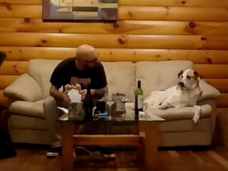 ご主人様がごちそうを食べようとしているのを、物欲しそうに見つめる犬。
