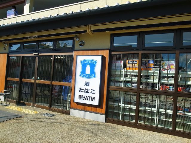「ローソン」の看板には、青地に白のミルク缶マークが描かれています。