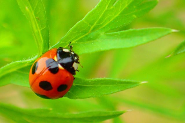テントウムシは、英語圏(えいごけん)では「ladybird(レディー・バード)」、また「lady bug(レディー・バグ)」と呼ばれますが、確かに女性のようないでたちです。